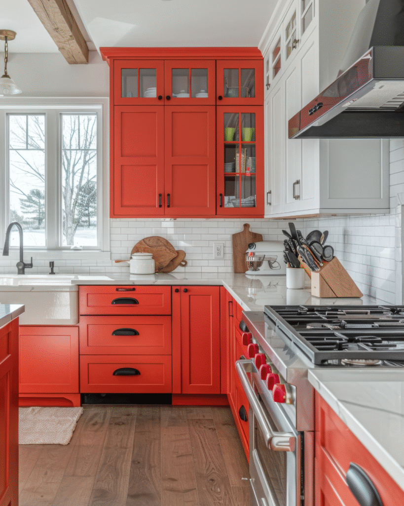 Cozinha | Laranja + azul / Vermelho + cinza claro |